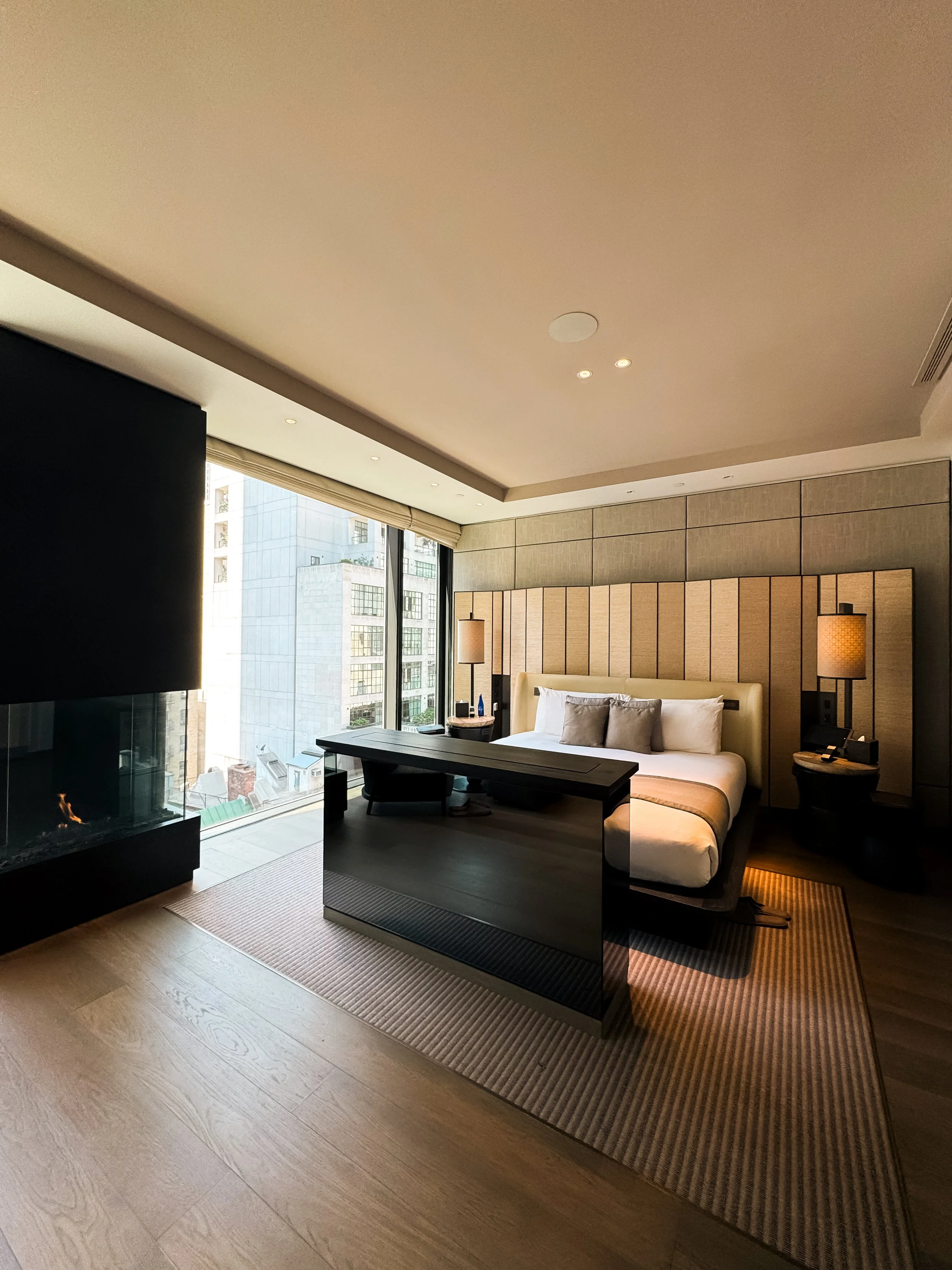 For me, the highlight of the room was the working fireplace, an uncommon luxury in New York hotels, adding warmth and intimacy to the space. Movable illuminated partitions allow guests to open the bathroom or close it off for more privacy — a signature touch of AMAN’s design philosophy.